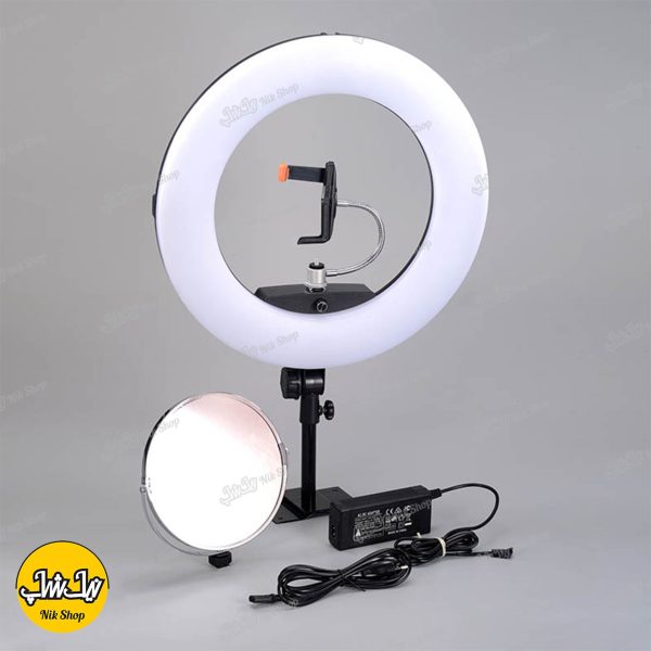 کلوین متغییر در این مدل به شما امکان می دهد که کلوین (3200K-5500K±200K) نور خود را با حداکثر دقت کنترل کنید. قطر خارجی این رینگ لایت 45 سانتی متر و قطر داخلی آن 32 سانتی متر است. گیره اتصال به موبایل و آینه ساده و مقعر در این مدل برای عکاسی سلفی به شما کمک می کند. CRI بالاتر از 95 حداکثر دقت در رنگ را برای شما بوجود می آورد. دو پیچ گردشی وظیفه کم و زیاد کردن شدت نور و کلوین را بر عهده دارند. عمر ال ای دی های این مدل بیش از 50000 ساعت است و شما میتوانید شدت نور این رینگ لایت را از 10 تا 100 درصد تغییر دهید.